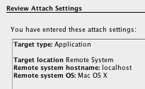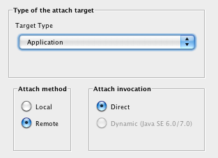Attach Mode. Select Application with Remote and Direct options.